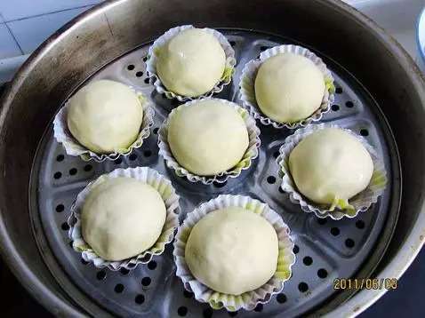 4.把面團(tuán)分成小劑子,取一個(gè),搓圓壓扁,把豆沙餡放在中間。